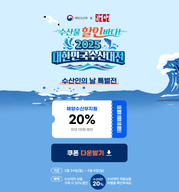 출처 공영쇼핑 https://www.gongyoungshop.kr/event/selectEventDetail.do?eventNo=1728 '대한민국 수산대전' 기간 동안 수산물 20% 할인 쿠폰이 발급됩니다. ID당 1주일에 한 장씩 발급받을 수 있으며, 최대 1만원까지 할인된다고 하니 놓치지 마시기 바랍니다.
