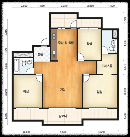 평면도는 위 그림처럼 치수도 적혀있으니, 장롱이나 침대등 큰 가구들은 줄자를 활용하여 미리 계획해 보시기 바랍니다.
